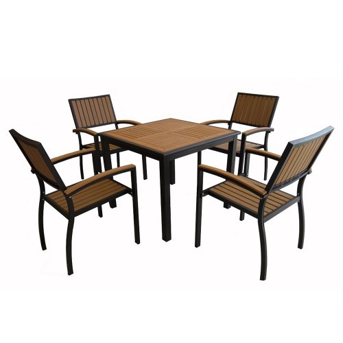 Bring a new dining area to any patio or deck with this five-piece dining set. This all-weather set features a cast aluminum, powder-coated frame complimented with unique, poly-synthetic wood accents. Set includes dining table and four dining chairs. Enjoy the luxury of delightful conversation in the open air with this exclusive dining set.