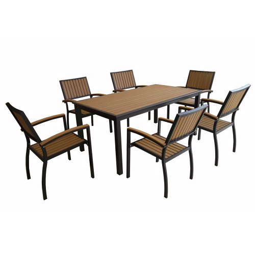 Bring a new dining area to any patio or deck with this seven-piece dining set. This all-weather set features a cast aluminum, powder-coated frame complimented with unique, poly-synthetic wood accents. Set includes dining table and six dining chairs. Enjoy the luxury of delightful conversation in the open air with this exclusive dining set.