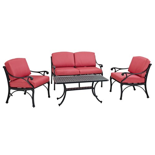 - Set includes table, two chairs and loveseat with cushions