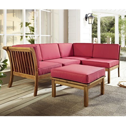 This charming sectional sofa and ottoman will add the perfect welcoming touch to any patio or intimate outdoor setting. Constructed from solid acacia hardwood, this set is naturally sturdy and stylish. Set includes sectional sofa with plush, soft cushions and ottoman. The innovative design allows the sofa to be used as four large, deep seated chairs. Remove the cushion from the ottoman and conveniently use it as a coffee table.